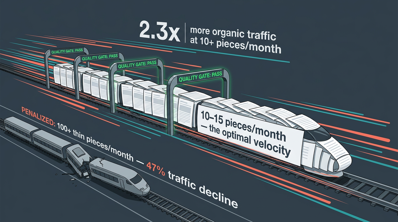 Content velocity matters in 2026. Freshness, topical authority, and competitive pressure all demand high publishing frequency. But velocity without quality is fatal.
