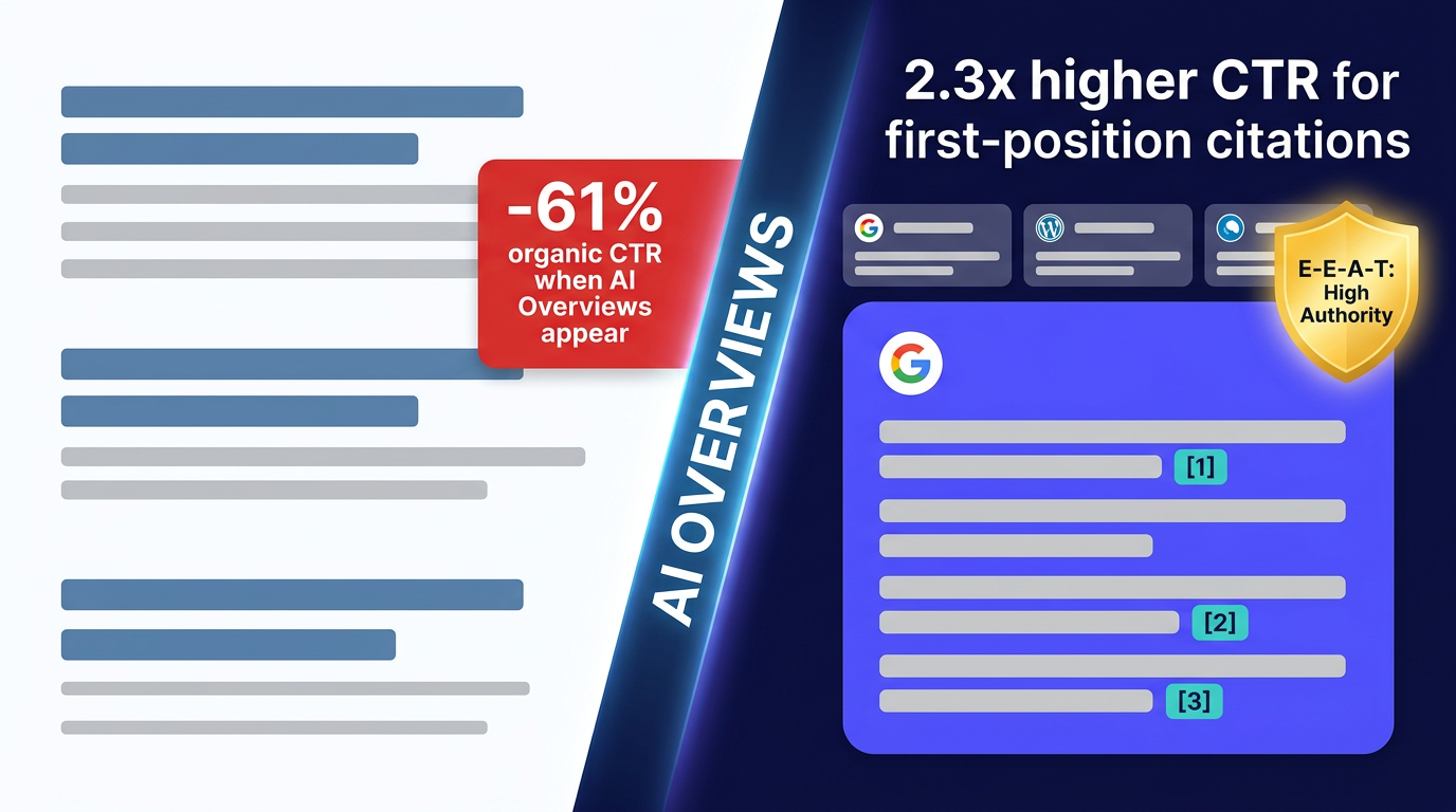 For many publishers, AIOs already impact organic traffic, especially for informational queries. Recent data from Ahrefs (2026) shows that pages featured in first-position AIO citations see a 40% average traffic increase, while those not cited see a 15% decline. But this shift also creates opportunities. Websites featured in AIO citations often gain authority and brand visibility, even if click-through rates vary. First-position citations typically achieve 28-35% click-through rates, compared to 20-25% for traditional organic Position 1.