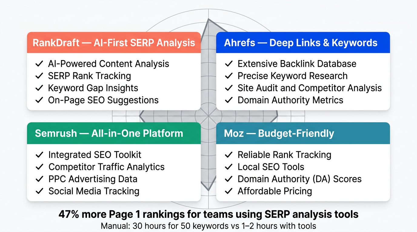 Recent data from Search Engine Land (2026) shows that teams using dedicated SERP analysis tools see 47% more Page 1 rankings and 2.8x more AI citations than teams relying on manual research.