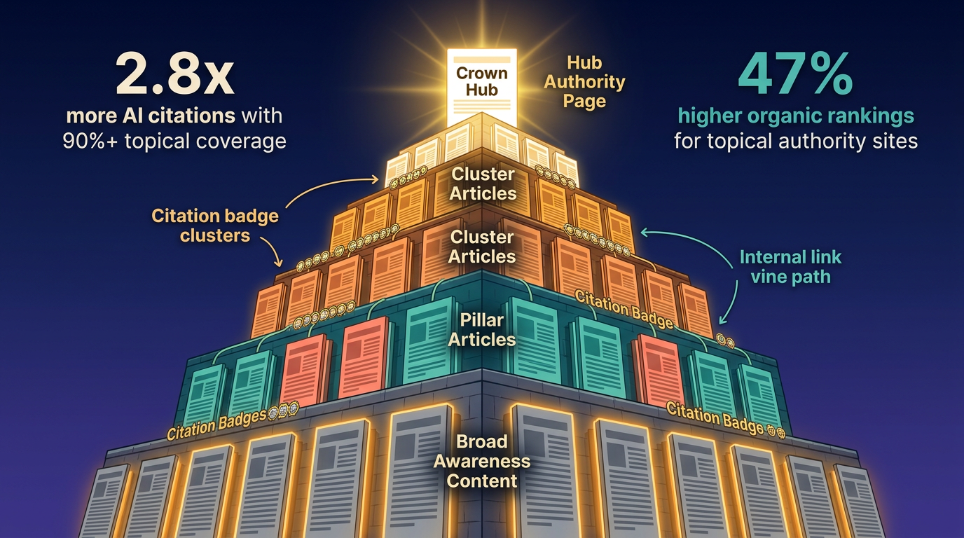 Sites with topical authority see 2.8x more AI citations, 47% higher organic rankings, and 62% more featured snippets.